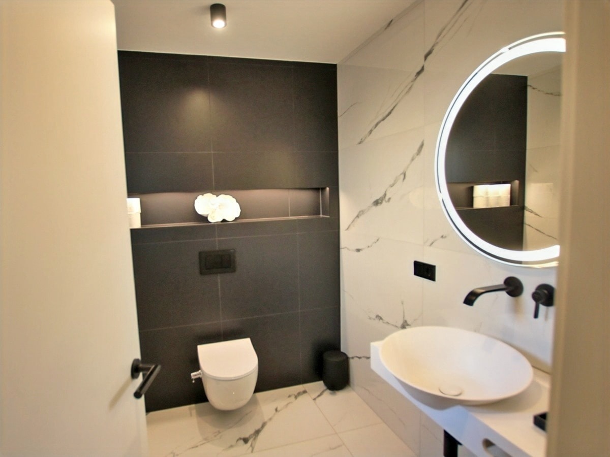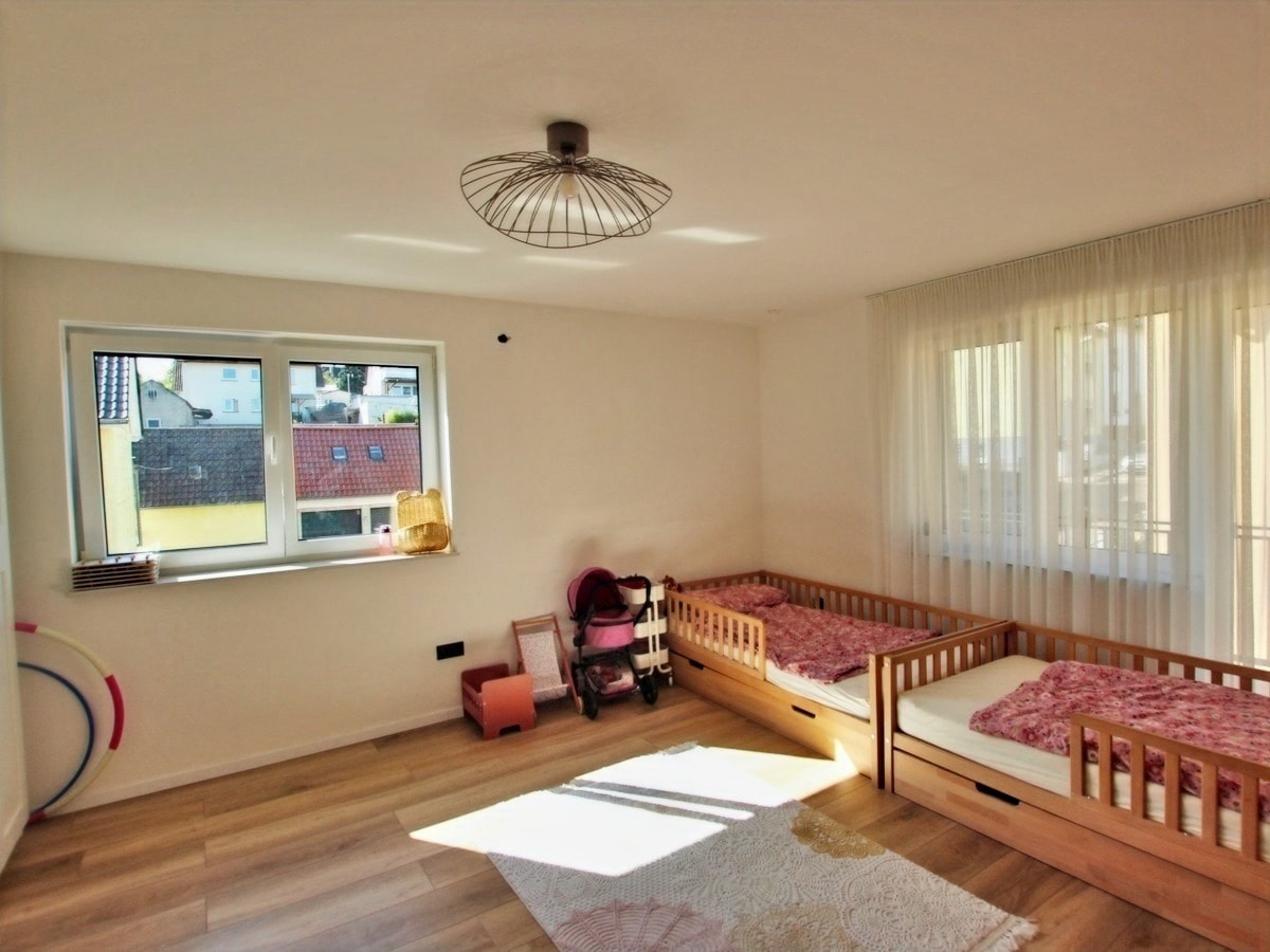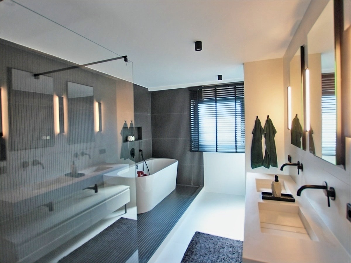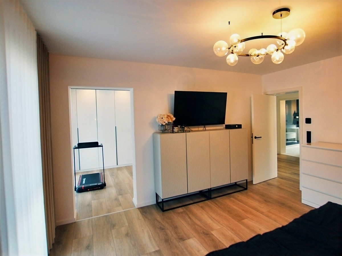 Das Obergeschoss bietet zwei Schlafzimmer, einen Hauswirtschaftsraum sowie ein sehr großes traumhaftes Badezimmer mit bodenebener Dusche und einer Badewanne. An das Hauptschlafzimmer grenzt ein begehbares Ankleidezimmer.