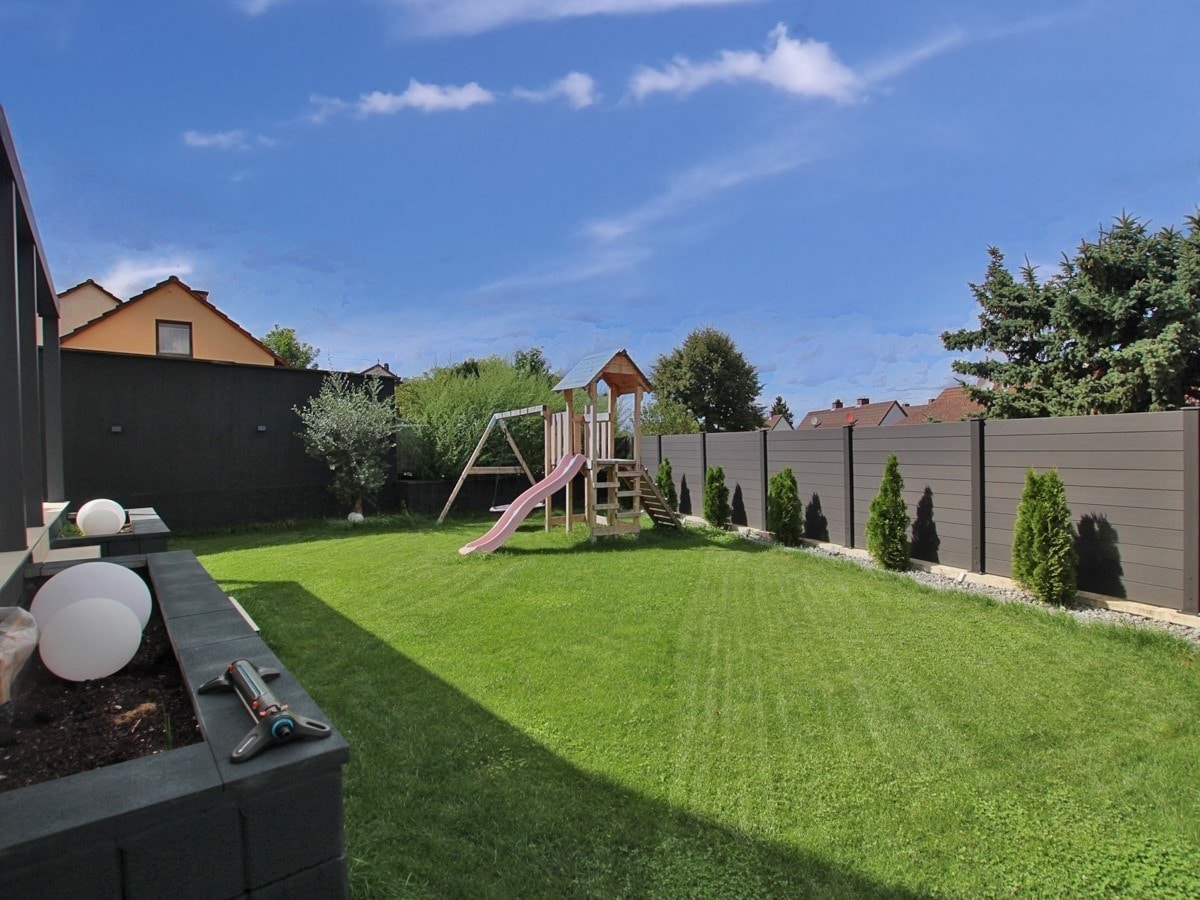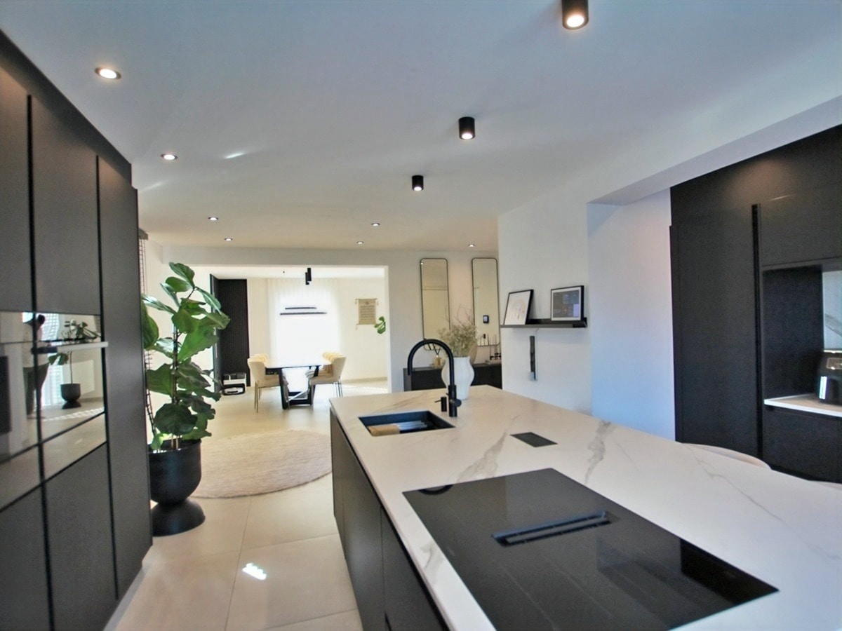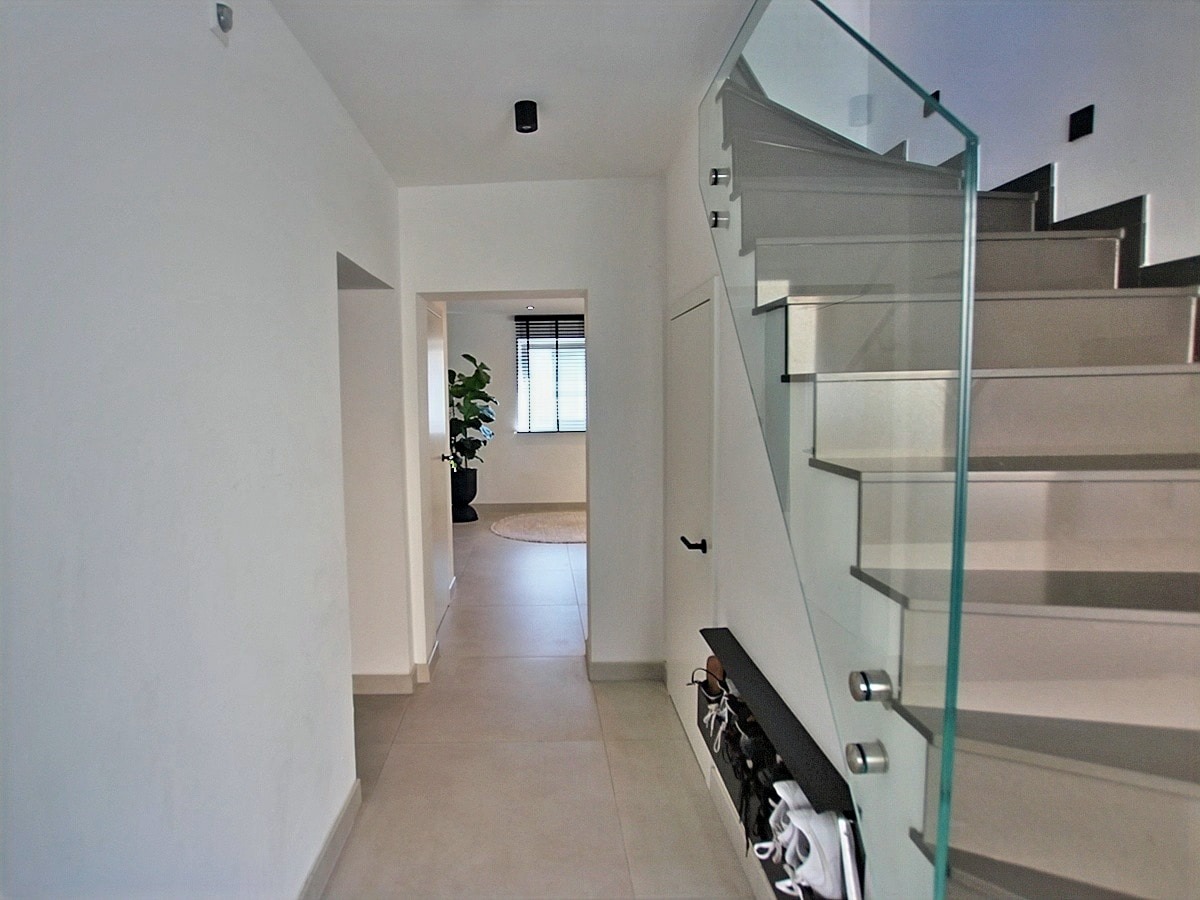 Im Erdgeschoss befindet sich das großzügige Wohn- und Esszimmer mit modern gestalteter, offener Küche. Die Einbauküche ist bereits im Kaufpreis enthalten und bietet diversen Luxus, wie z.B. eine integrierte Kaffeemaschine oder einen versteckten Abstellraum. Von hier aus sind ebenfalls die großzügige Terrasse sowie der schöne Garten begehbar. Die Terrasse ist vollständig überdacht. Der Wohnbereich im Erdgeschoss wird durch ein Gäste-WC, zwei Abstellräume sowie eine Diele inkl. Garderobe komplettiert.