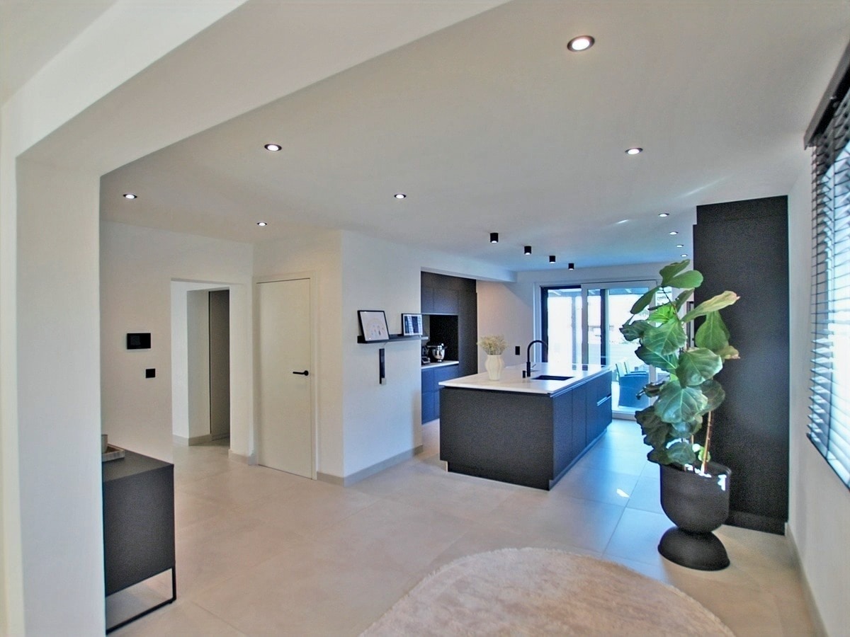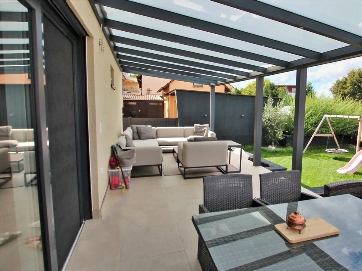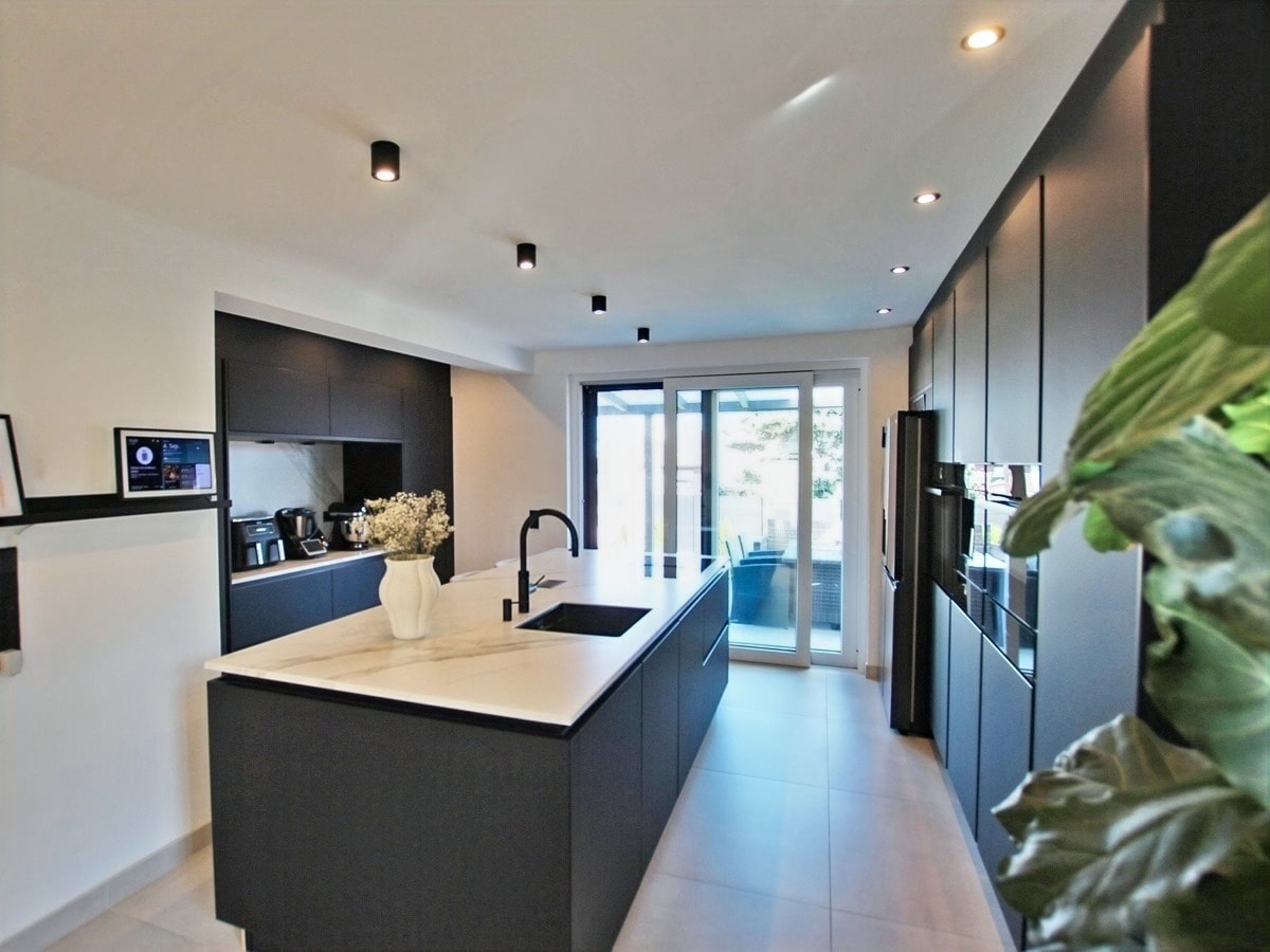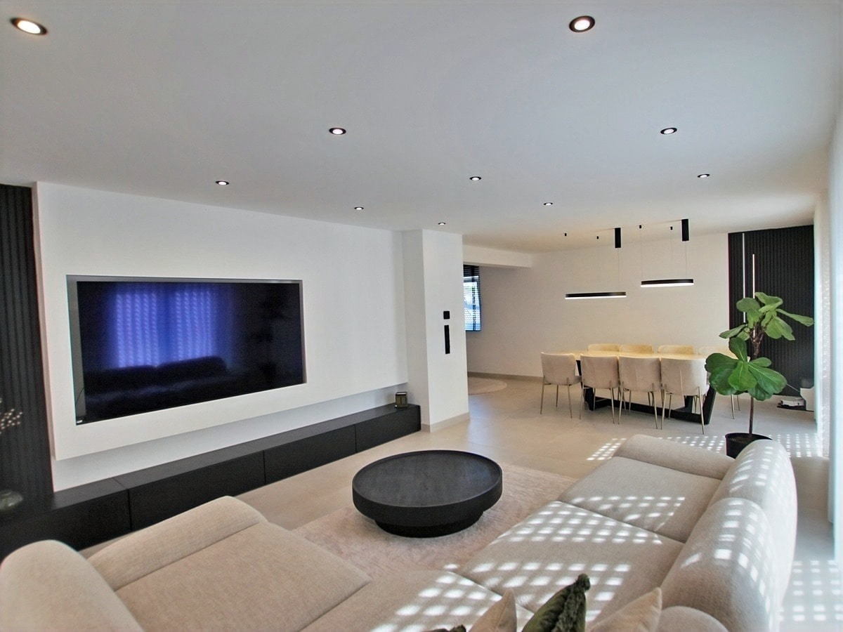 Im Erdgeschoss befindet sich das großzügige Wohn- und Esszimmer mit modern gestalteter, offener Küche. Die Einbauküche ist bereits im Kaufpreis enthalten und bietet diversen Luxus, wie z.B. eine integrierte Kaffeemaschine oder einen versteckten Abstellraum. Von hier aus sind ebenfalls die großzügige Terrasse sowie der schöne Garten begehbar. Die Terrasse ist vollständig überdacht. Der Wohnbereich im Erdgeschoss wird durch ein Gäste-WC, zwei Abstellräume sowie eine Diele inkl. Garderobe komplettiert.