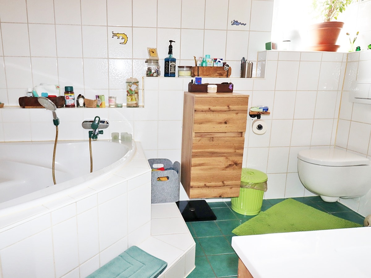 – Tageslichtbad im OG mit Eckwanne, Dusche, Waschbecken und WC