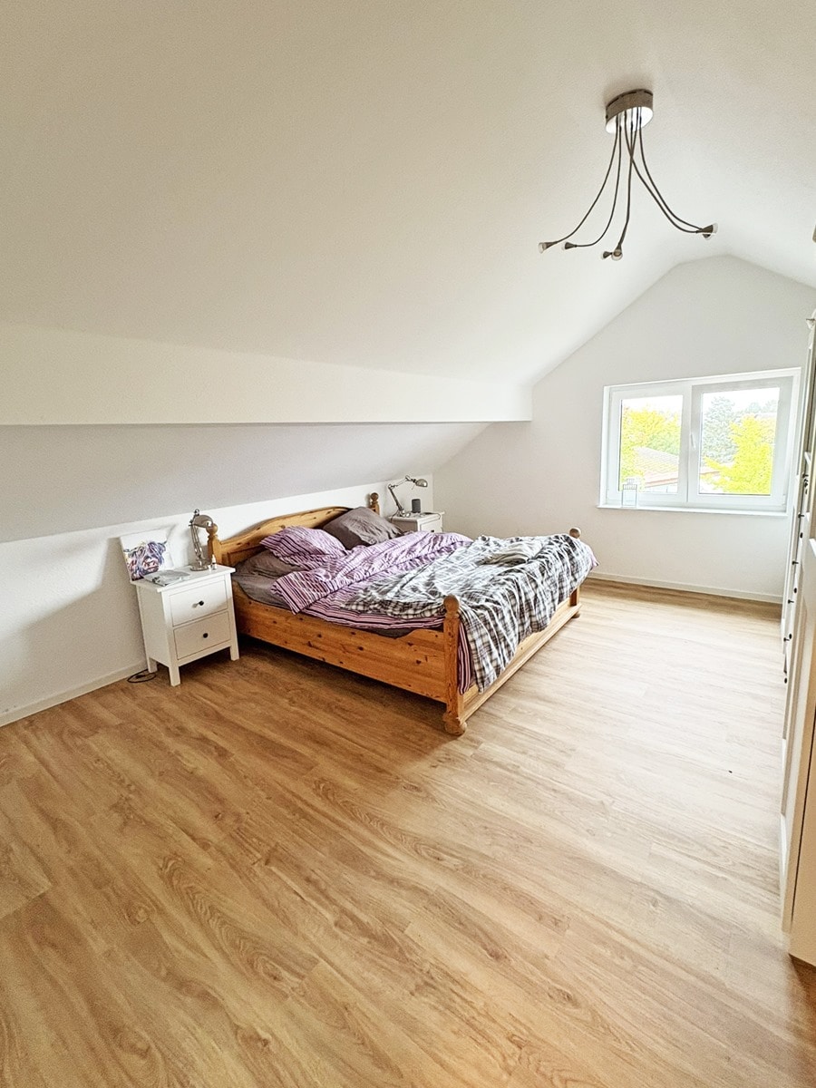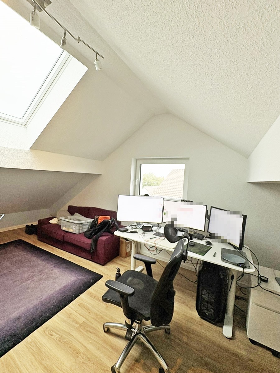 Im Dachgeschoss stehen zwei weitere flexibel nutzbare Zimmer (z. B. Büro, Gäste- oder Hobbyraum) sowie ein zusätzliches WC zur Verfügung. In den Dachschrägen bieten integrierte Stauraumfächer zusätzlichen Platz. Die Kombination aus zwei Wohnebenen ermöglicht ein angenehmes Trennen von Wohnen, Arbeiten und Schlafen.