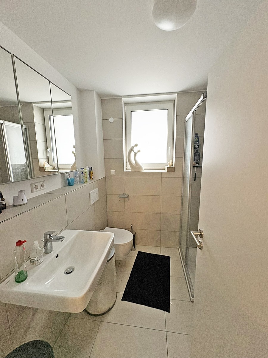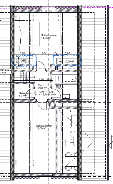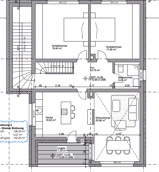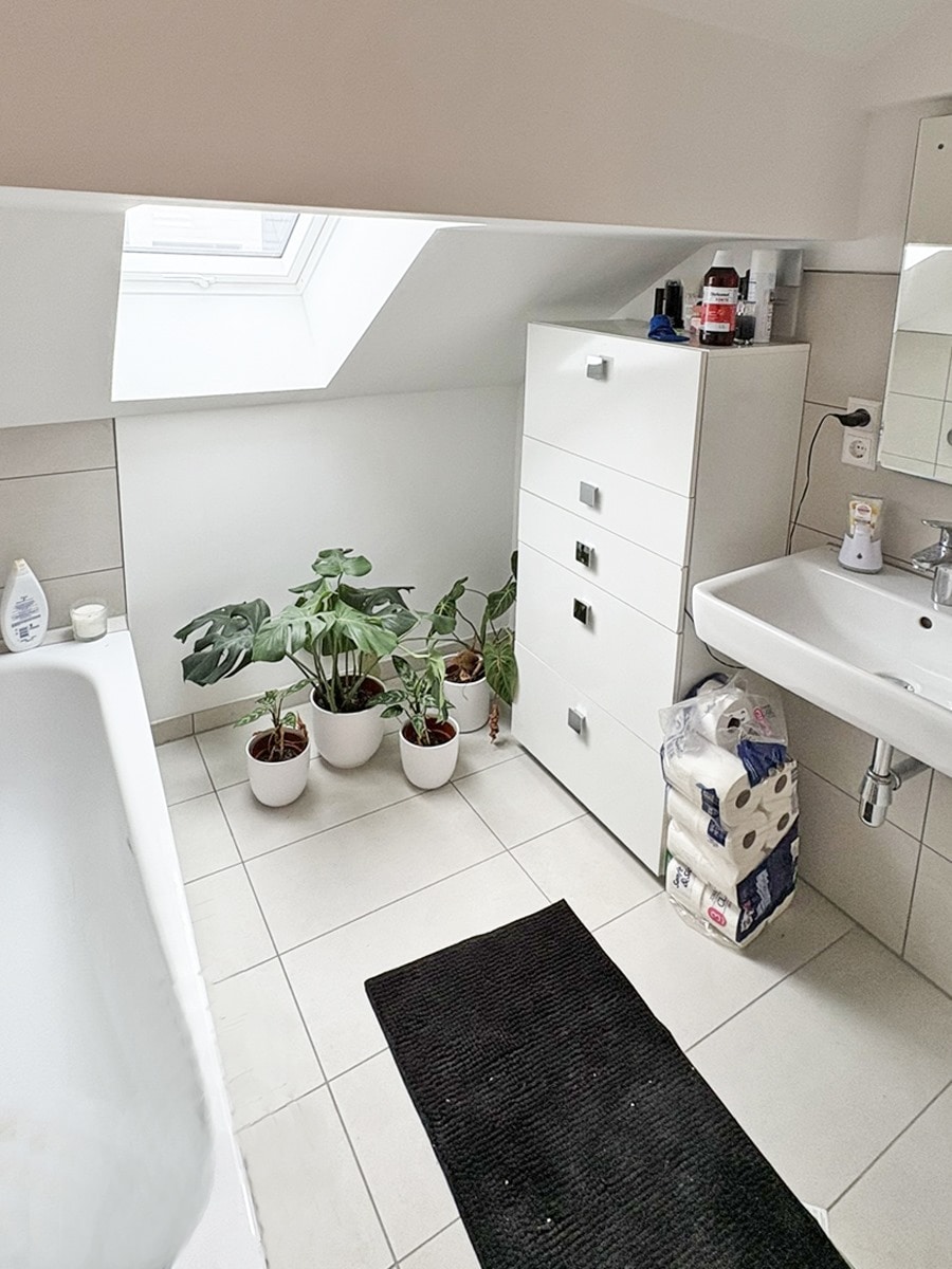 Die erste Wohnebene umfasst drei gut geschnittene Schlafzimmer, ein modernes Tageslichtbad mit bodenebener Dusche sowie eine Küche, die genügend Platz für Ihre eigene Einbauküche bietet. Von hier aus gelangen Sie direkt auf die zur Wohnung gehörenden Loggia.