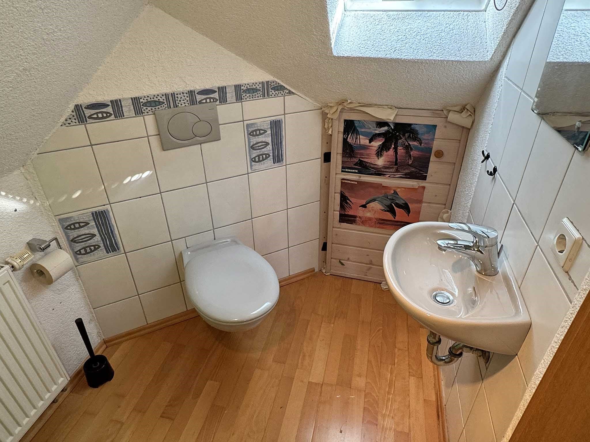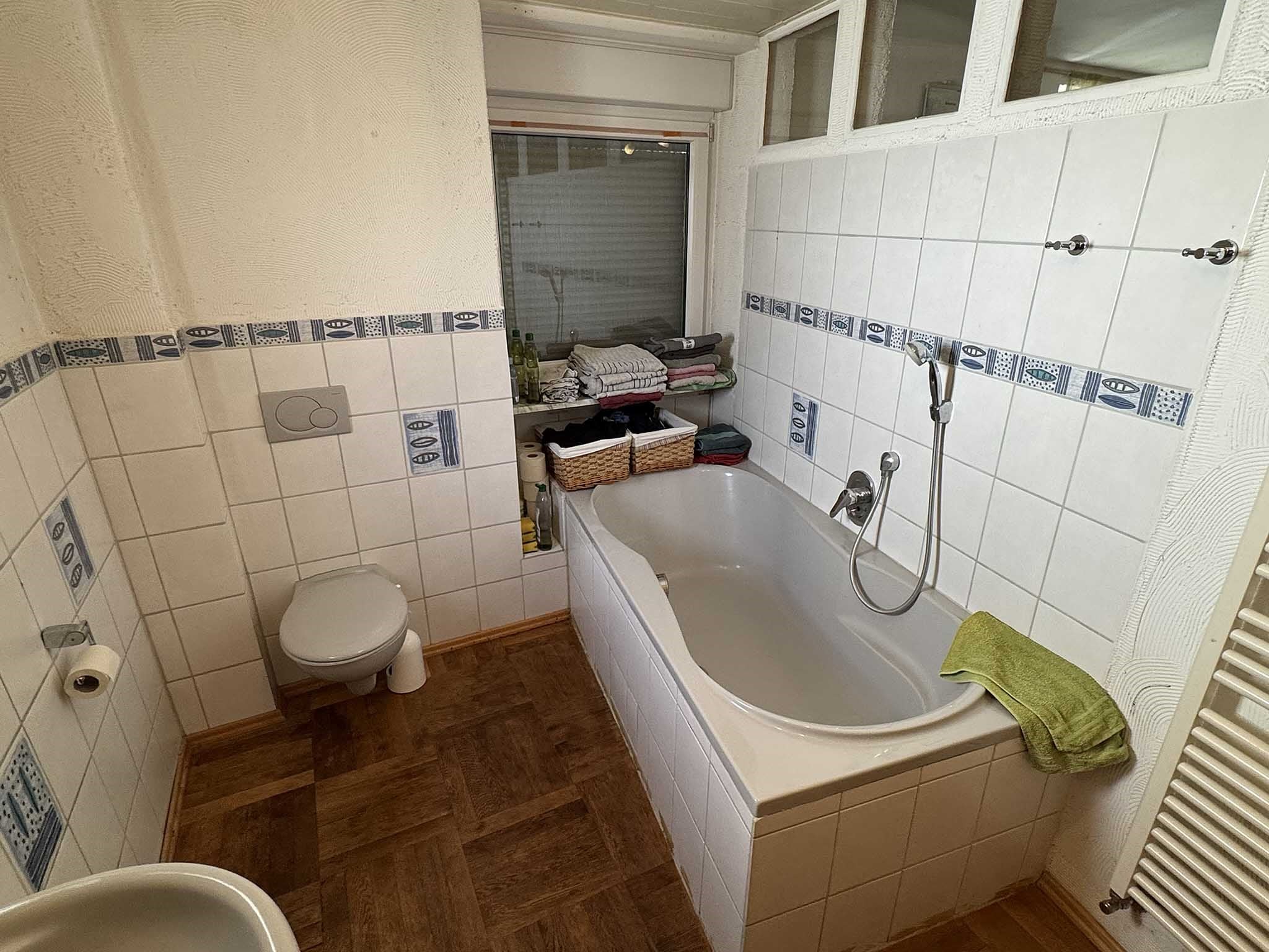 Im Obergeschoss liegen zwei gut geschnittene Zimmer, die sich flexibel als Schlaf-, Kinder- oder Arbeitsräume nutzen lassen. Zudem gibt es einen separaten Waschraum, der den Hauswirtschaftsbereich praktisch ergänzt. Das helle Tageslichtbadezimmer ist mit einer Dusche und einer Badewanne ausgestattet.