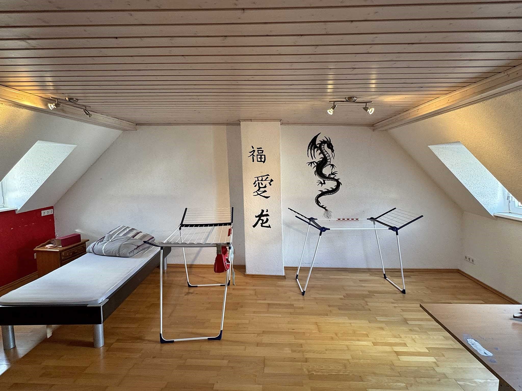 Das Dachgeschoss beherbergt ein großes Studiozimmer, welches durch seine Dachschrägen und die Holzdecke eine wohnliche Atmosphäre ausstrahlt. Dieser Raum eignet sich besonders gut als Schlafzimmer, Studio oder Hobbyraum. Zusätzlich steht auf dieser Etage ein separates WC zur Verfügung, was die Nutzung des Dachgeschosses als eigenständigen Wohnbereich erleichtert.